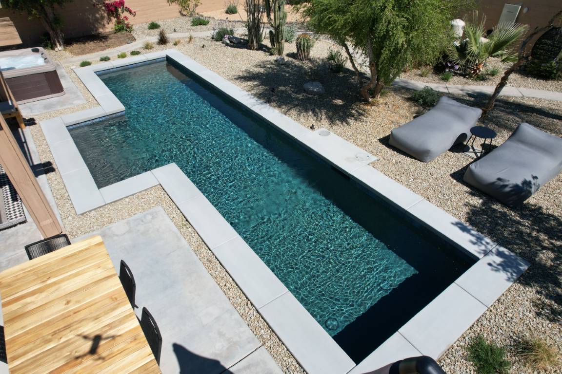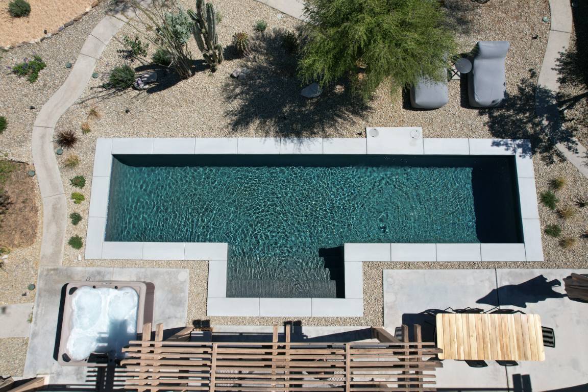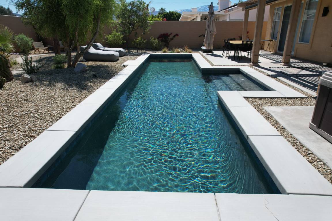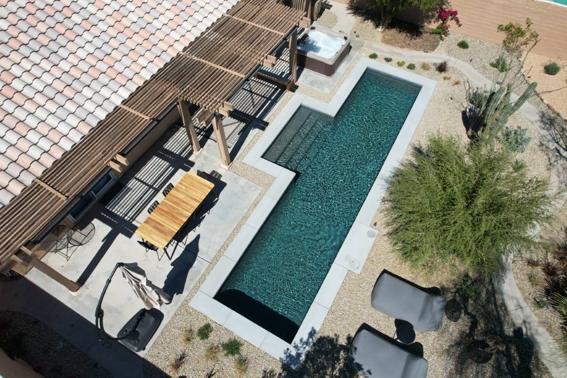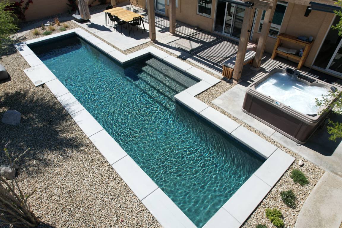 The pool’s clean, and aesthetic layout is accented by a light interior finish that amplifies its reflective qualities, making the water appear crisp and inviting throughout the day. A generous tanning ledge offers a peaceful space for lounging, while wide steps invite swimmers into deeper waters. The minimalist layout is both family-friendly and ideal for entertaining guests.