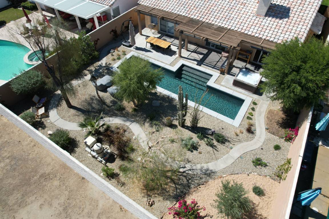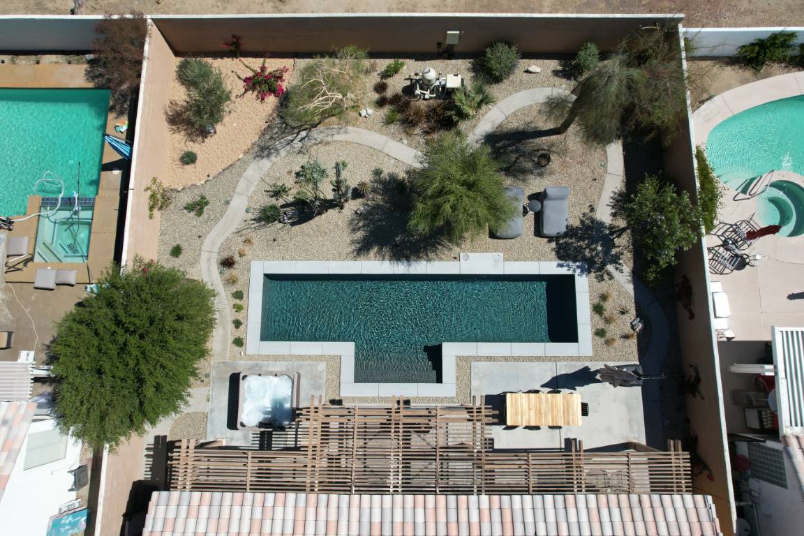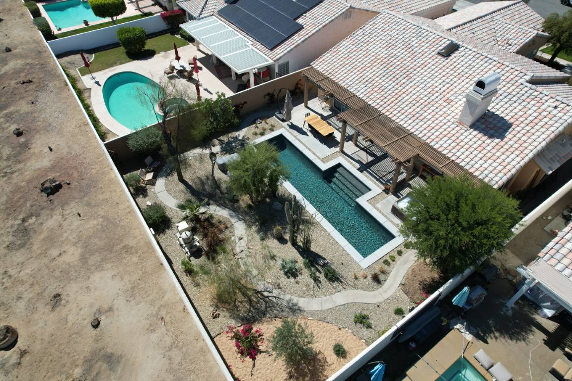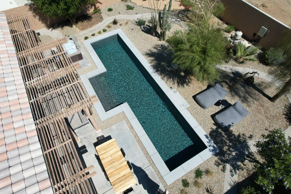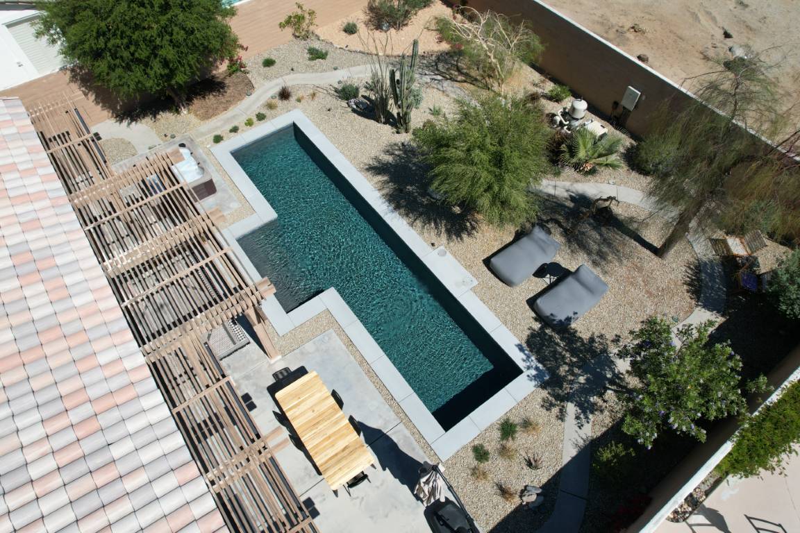 The pool’s clean, and aesthetic layout is accented by a light interior finish that amplifies its reflective qualities, making the water appear crisp and inviting throughout the day. A generous tanning ledge offers a peaceful space for lounging, while wide steps invite swimmers into deeper waters. The minimalist layout is both family-friendly and ideal for entertaining guests.