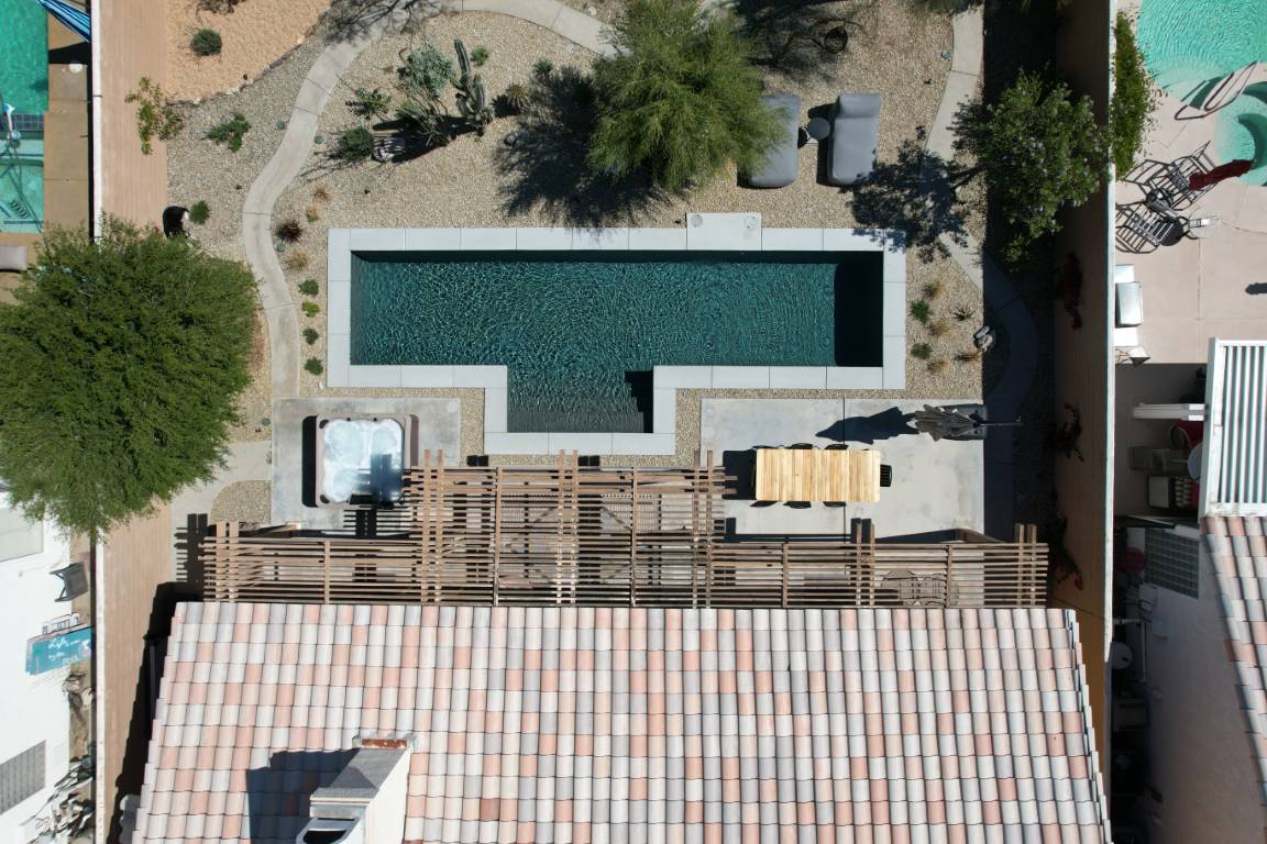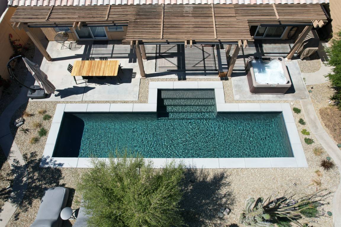 A custom water feature adds gentle movement and ambient sound, elevating the experience with spa-like serenity. The surrounding deck, finished in neutral stone, provides a durable and stylish foundation for outdoor furniture and open-air living.
