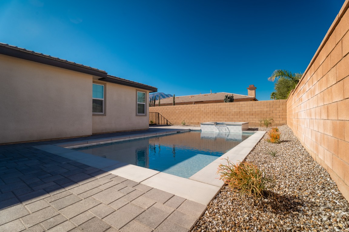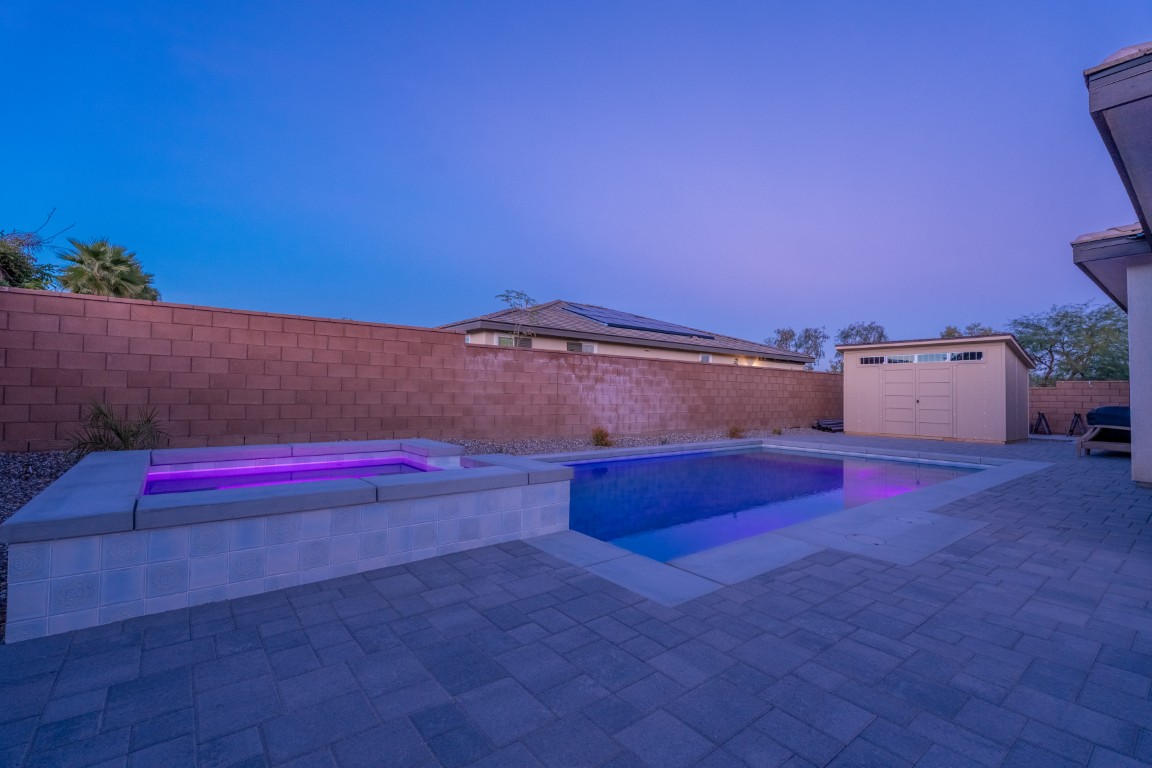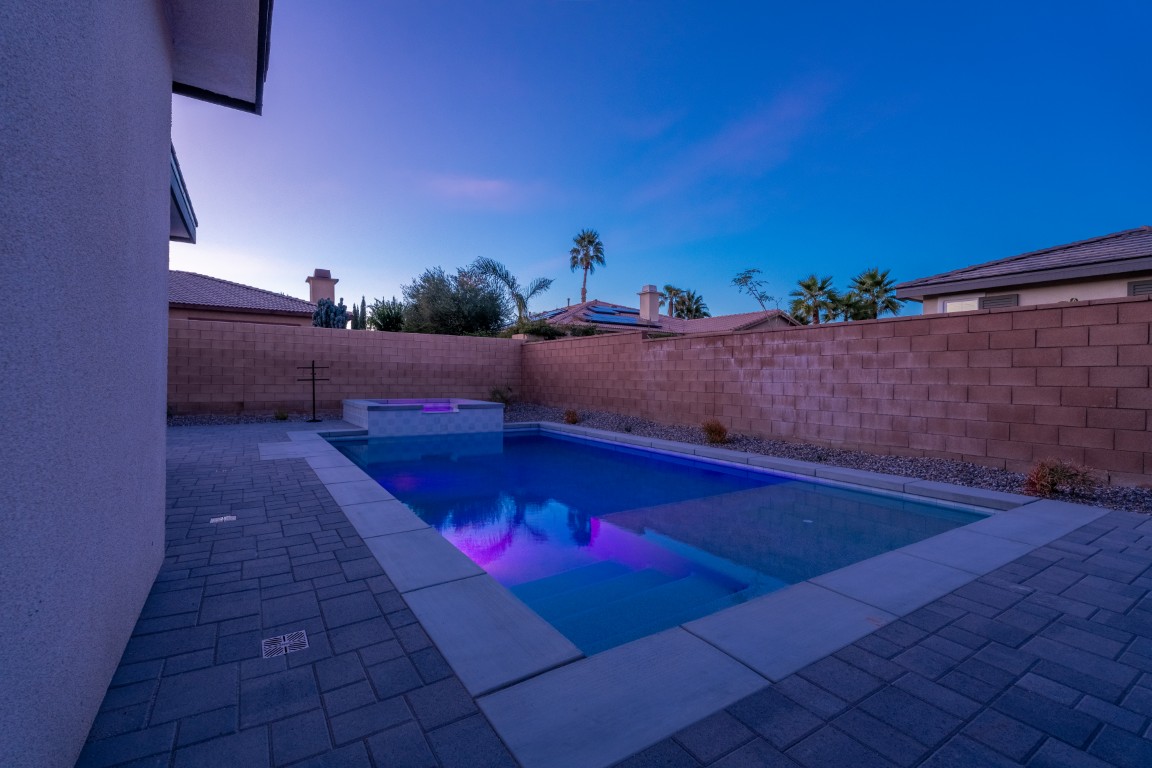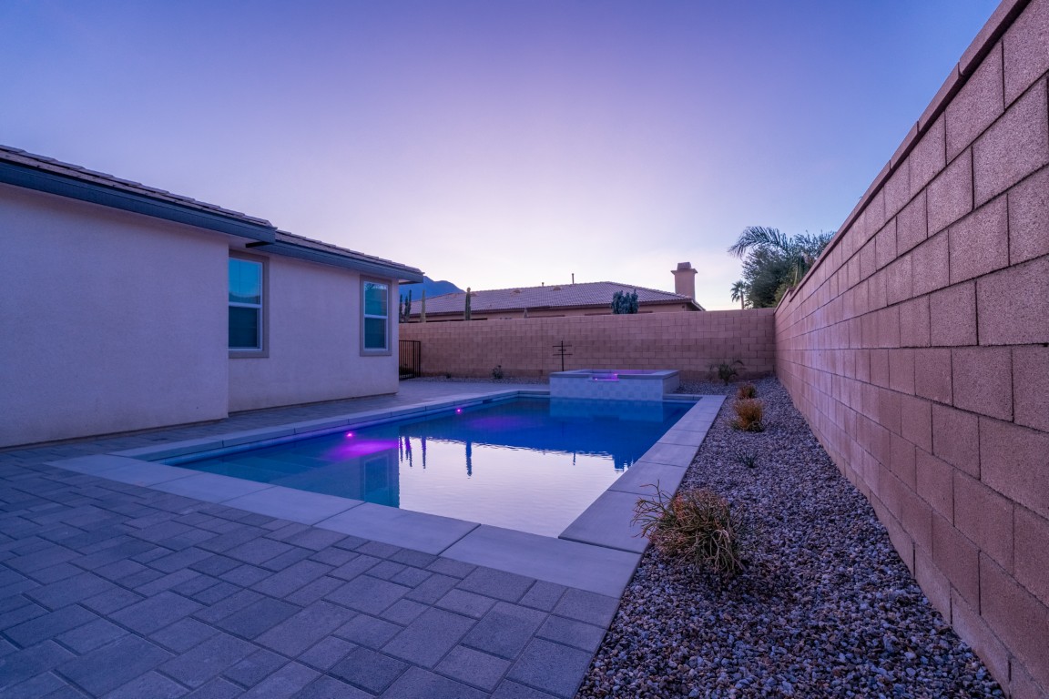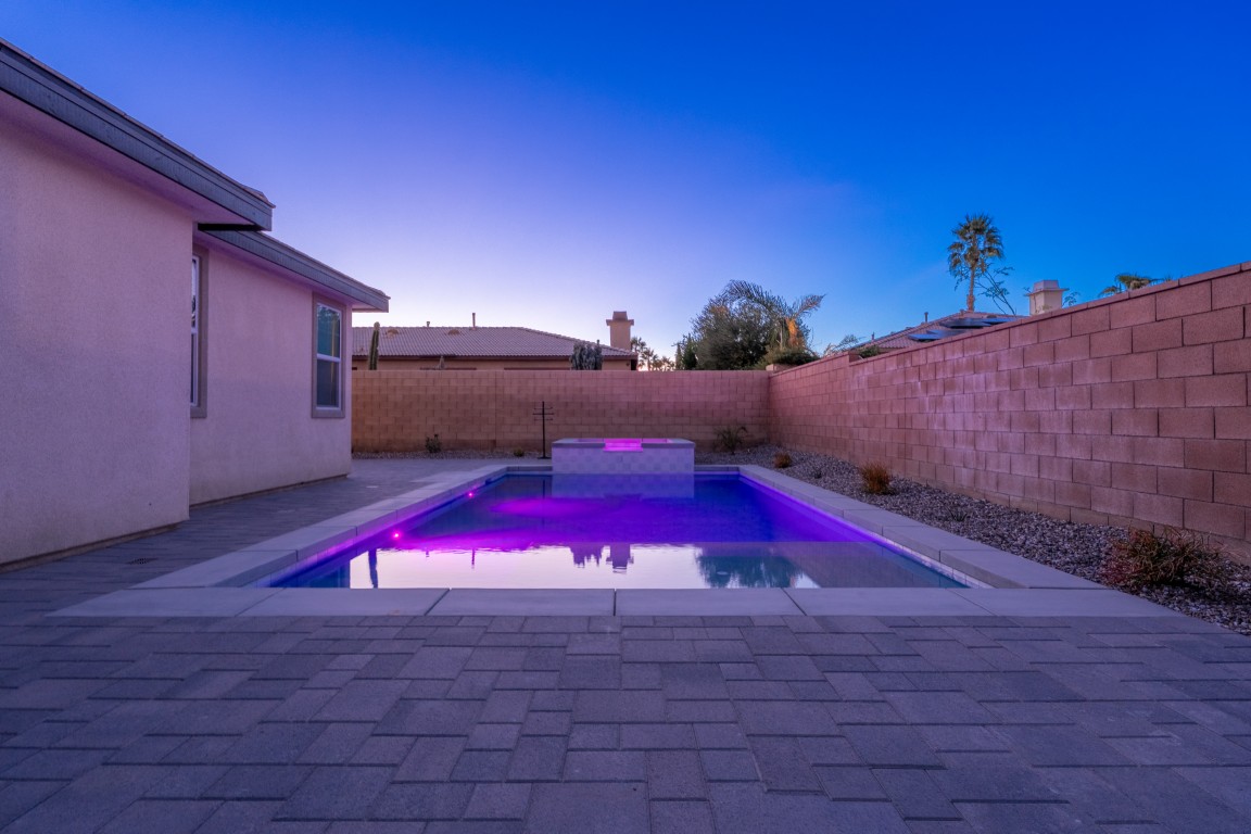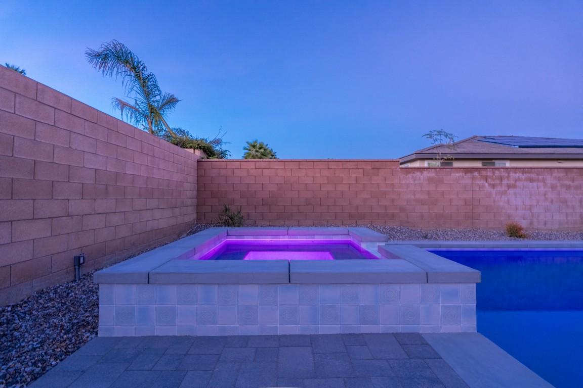 The pool itself offers generous swimming space, ideal for both relaxation and aquatic exercise. Wide entry steps provide comfortable access while doubling as a lounging area for enjoying the water at a shallower depth. Integrated underwater lighting brings the pool to life after sunset, adding vibrant visual interest and enhancing the ambiance. In the image, the soft blue illumination blends effortlessly with the spa’s bold magenta glow, creating a memorable nighttime atmosphere that elevates evenings outdoors.