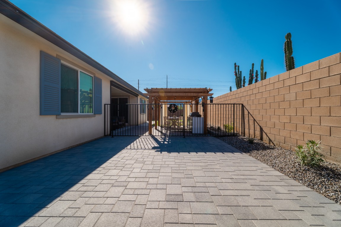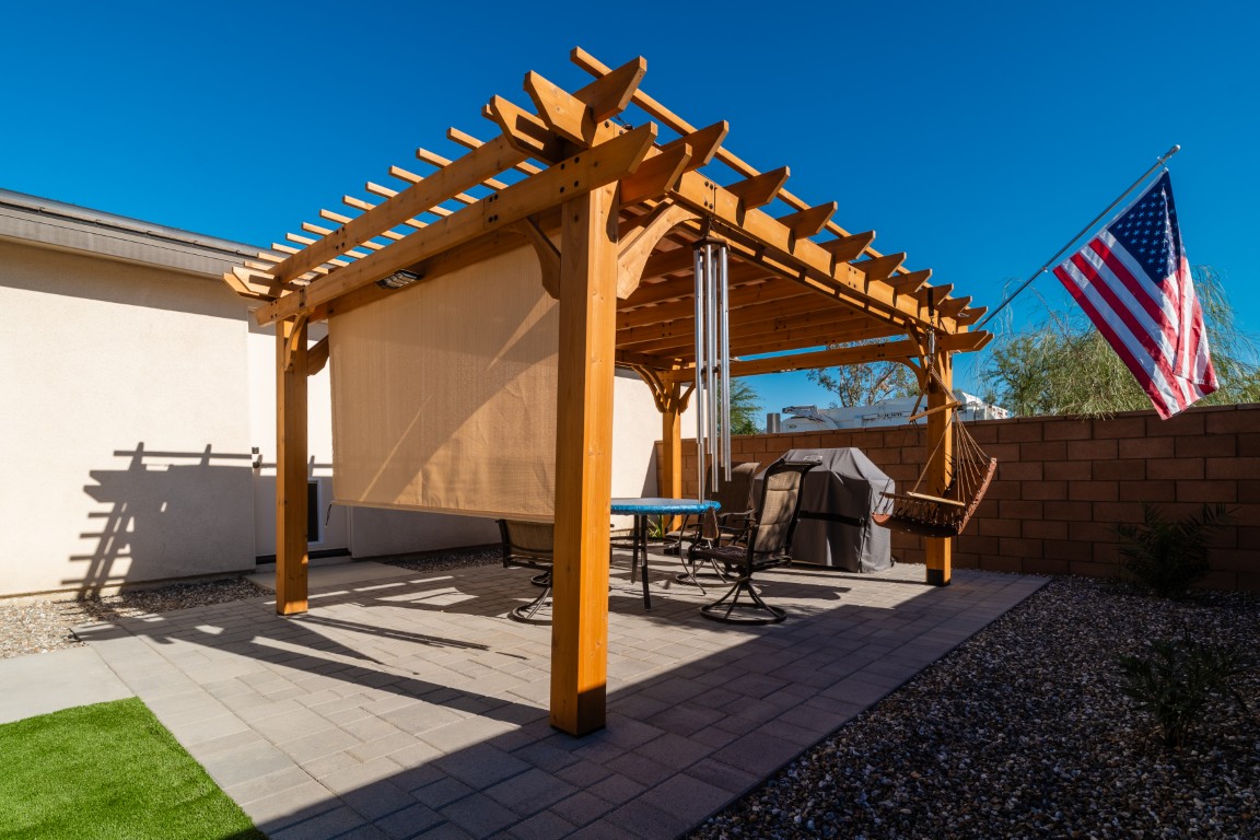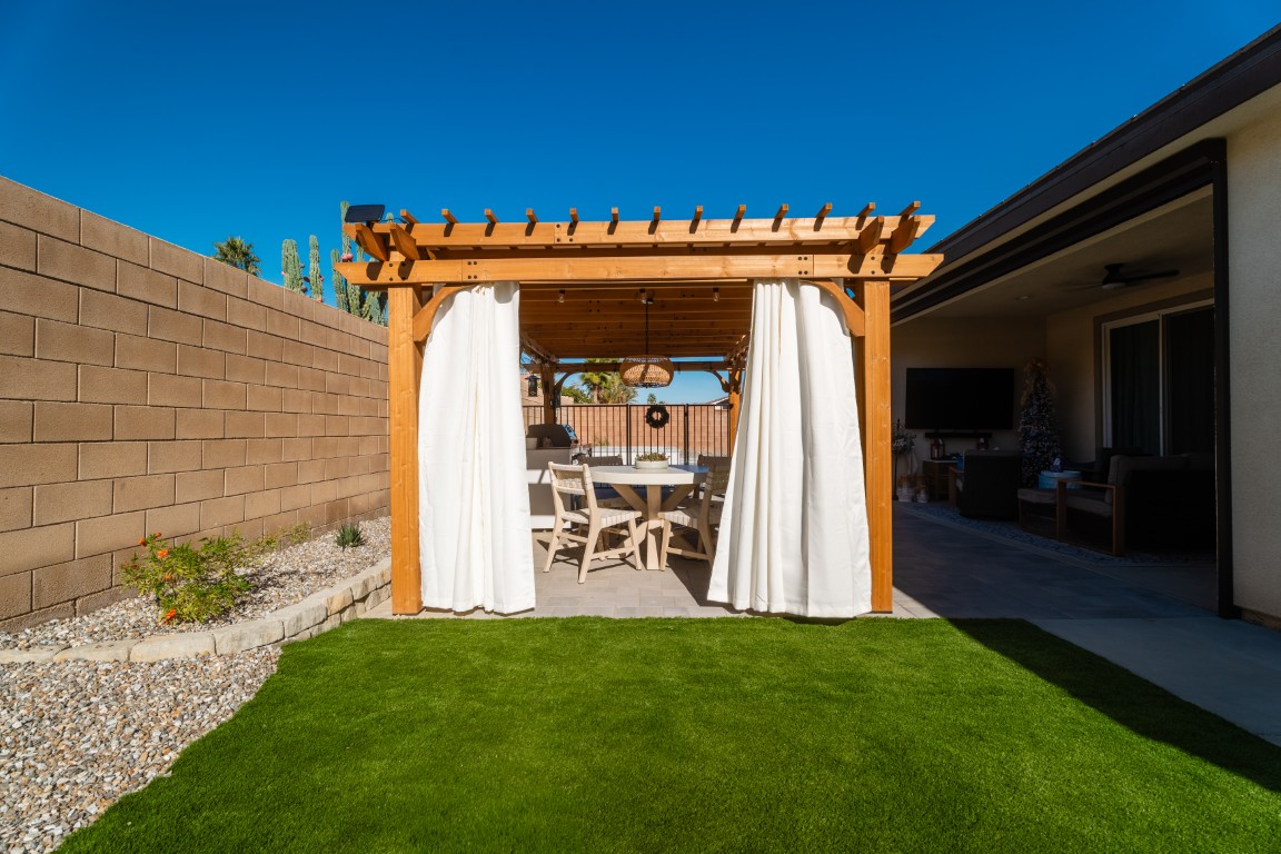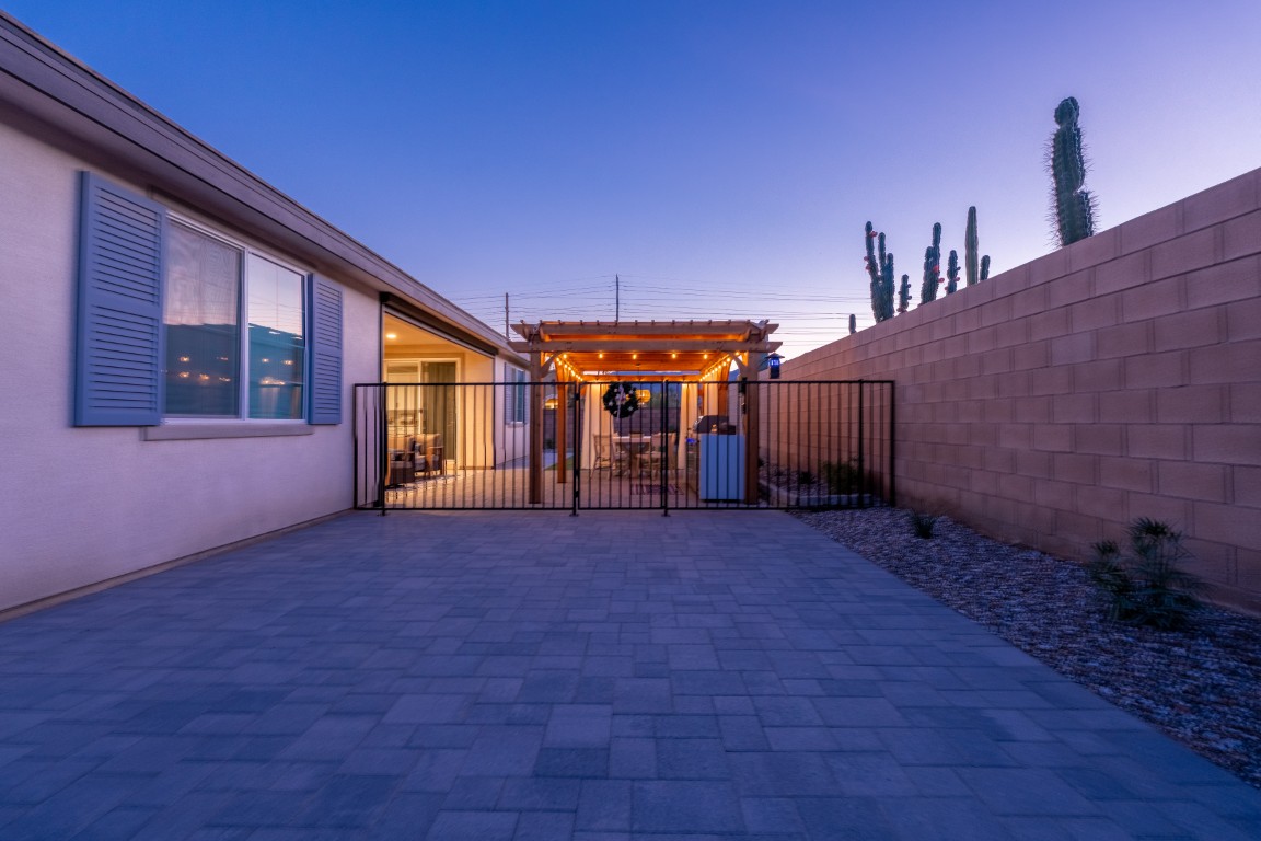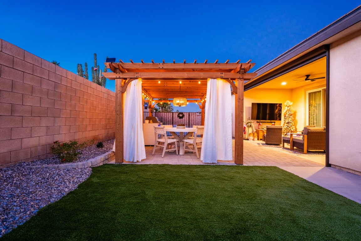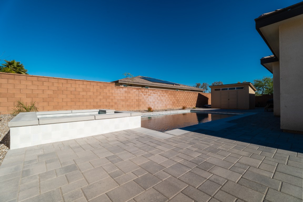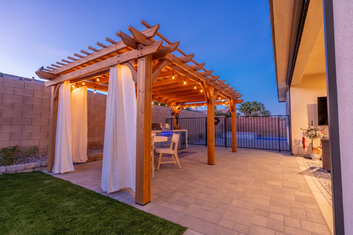 The pool itself offers generous swimming space, ideal for both relaxation and aquatic exercise. Wide entry steps provide comfortable access while doubling as a lounging area for enjoying the water at a shallower depth. Integrated underwater lighting brings the pool to life after sunset, adding vibrant visual interest and enhancing the ambiance. In the image, the soft blue illumination blends effortlessly with the spa’s bold magenta glow, creating a memorable nighttime atmosphere that elevates evenings outdoors.