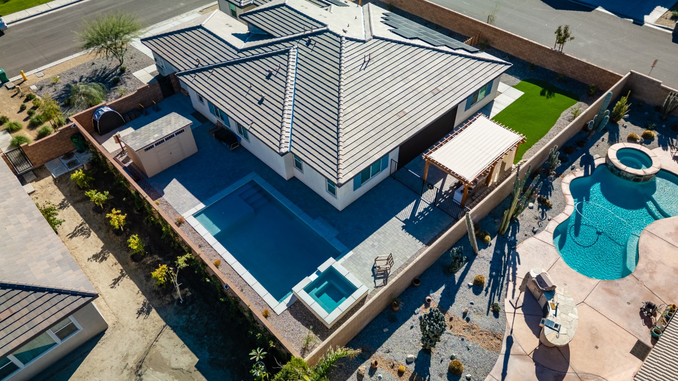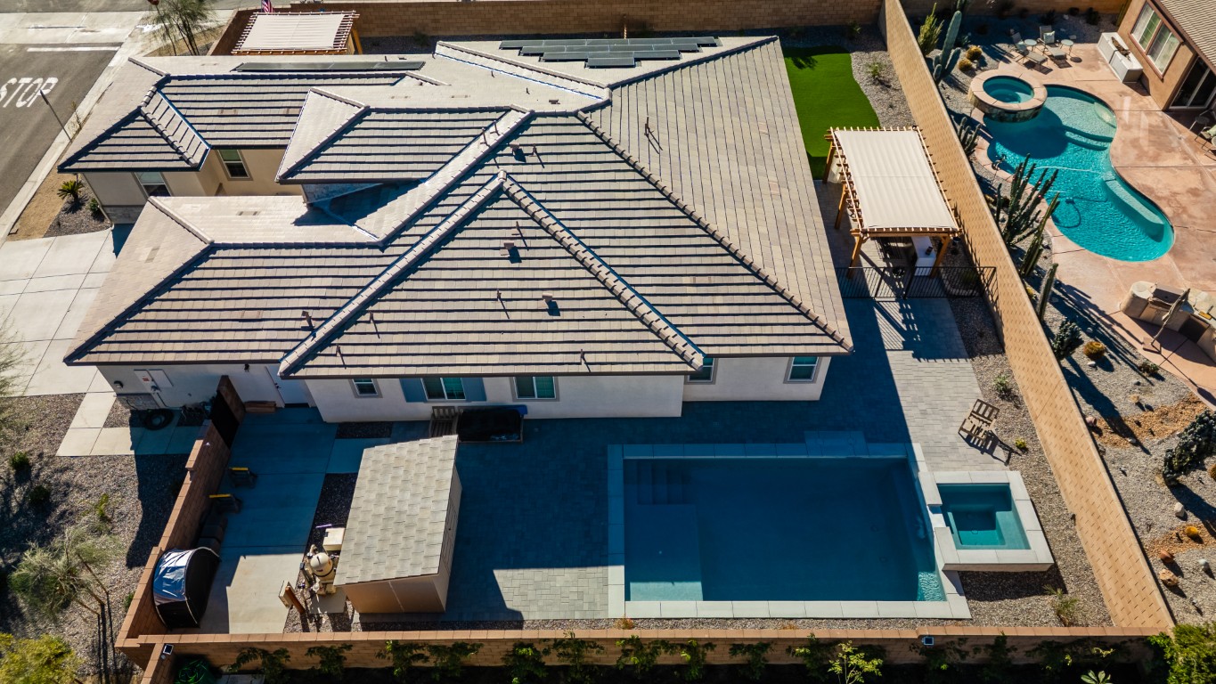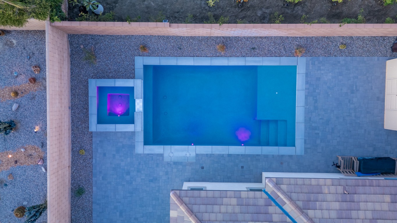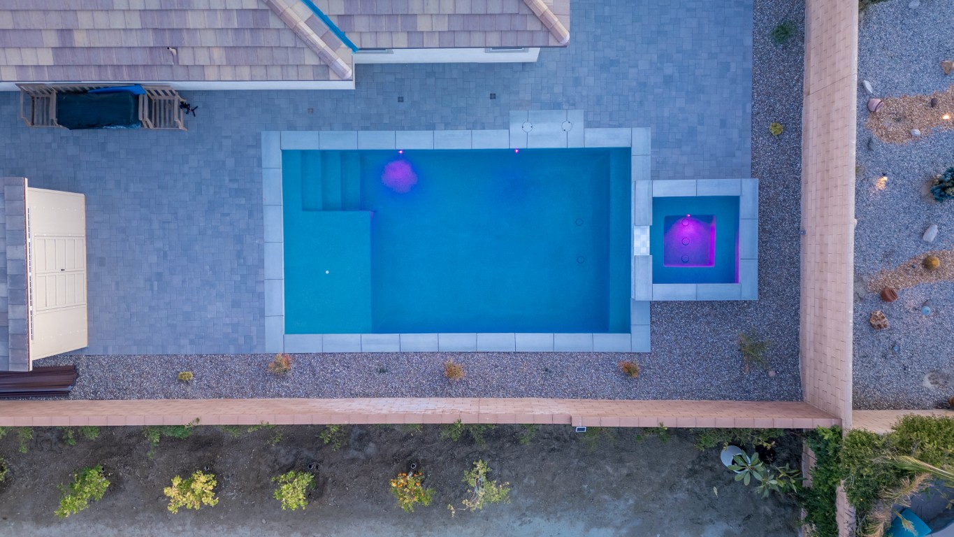 This luxury pool project in the Pasa Tiempo, CT area showcases a modern blend of elegance, clean geometry, and thoughtful outdoor design. From the aerial view, the layout highlights a spacious main pool paired with a dedicated spa, creating a private resort atmosphere right at home. The streamlined rectangular form gives the space a refined, contemporary feel, while the carefully planned hardscape ensures the entire area remains cohesive, balanced, and visually striking.